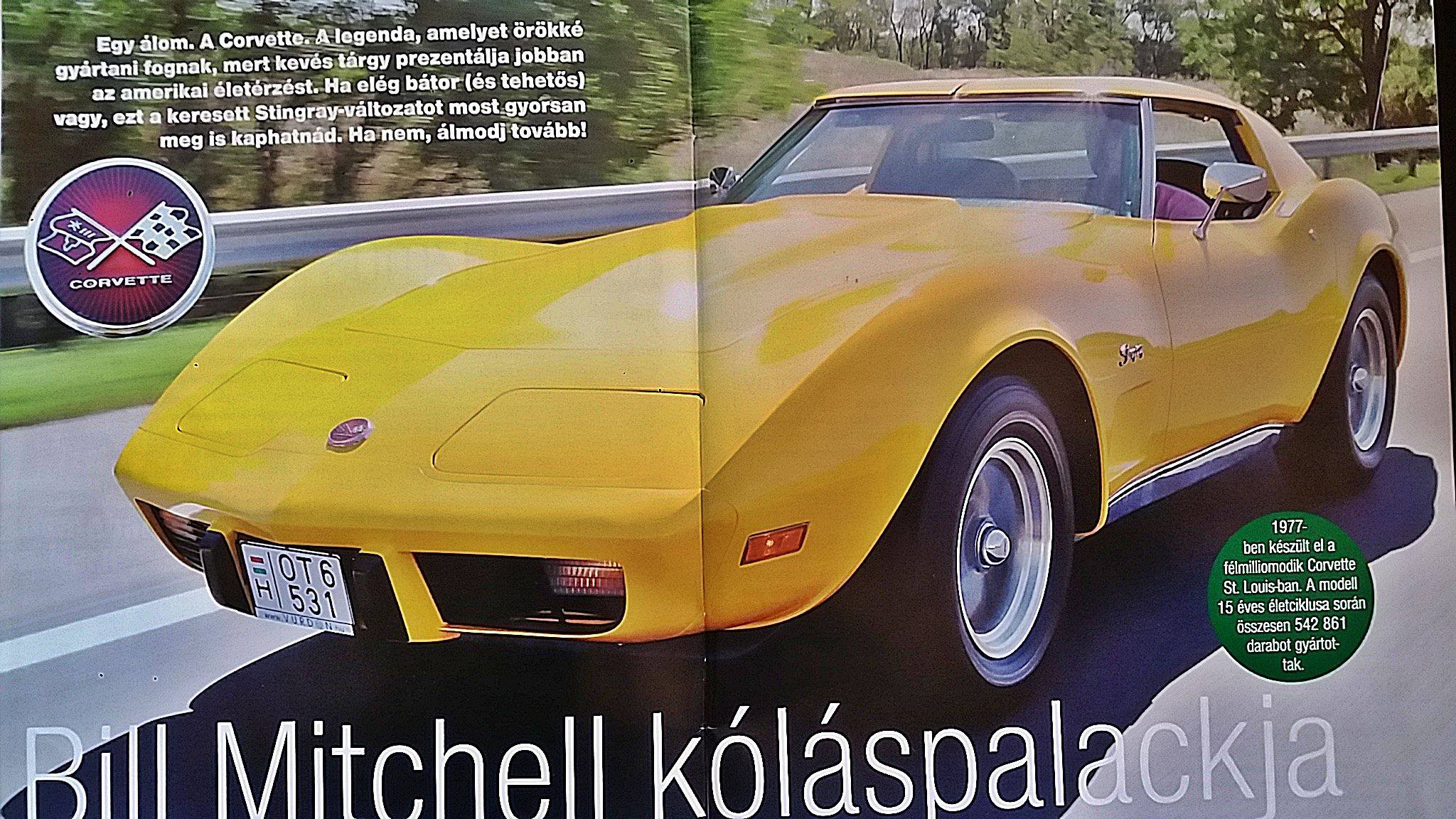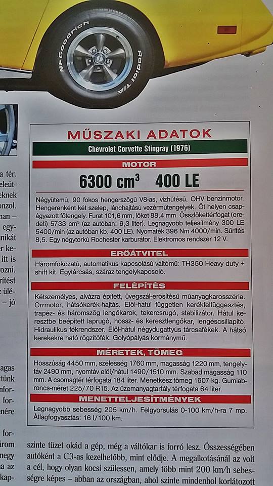 2012 őszén kezdtük el a munkát. Először is szétbontottuk üres felépítményig, majd a felépítményt is leszereltük az alvázkeretről, végül csak csupasz elemek voltak már előttünk. A lakatos munka a felépítmény hibáinak javításával kezdődött, ami nem volt egyszerű, ugyanis az alapvetően üvegszálas műanyag karosszériát egy acél váz tartja össze, ami gyárilag bele van sütve, nehéz hozzáférni, sokszor bravúros megoldásokra volt szükség. Az alvázat és bizonyos elemeket (pl. futómű, tartók, konzolok, stb.) elvittük homok fújatni és utána kezdtük javítani. Az alváz nagyon rossz állapotban volt (típusbetegség), több, ezidáig rejtett helyen kritikusan el volt gyengülve a rozsdától, máshol alattomosan belülről kezdte ki a korrózió. A lakatos munka végeztével örök életűre porfestettük kívül-belül. A fényezőnél sok gondot jelentett a felépítmény fix hézagainak beállítása, ami elvileg nem állítható. A Corvettek ugye műanyag felépítménnyel bírnak és nincs olyan csavaros, vagy kalapálható, alakítható lehetőség, mint a fémnél, hiszen törik, reped, nagyon kényes. Igaz, cserében könnyű. Végül a választott árnyalatú sárga fényezés került rá, ami gyönyörű lett, nagyon látványos, ízléses, harmonikus az autó stílusával. Minden tömítőzés, alvázfestés szintén elkészült. Közben a műhelyben a motort, váltót és differenciált szétszedtük. A motor kopott volt, még eredeti, tehát 350-esből 383 épített ún Stroker tuning motor lett belőle kovácsoltvas fődarabokkal, Új főtengelyt, hajtókarokat, nyugvó és hajtókarcsapágyakat, olajpumpát, speciális tuning vezérműtengelyt, vezérmű láncot+lánckerekeket, a hengerfejek is fel lettek újítva, nagyobb szelepeket kapott és új fészkeket, görgős himbasort és komoly portolást. Kívül polírozott szívócsonkot, 4 torkú, egyedi építésű porlasztót, teljesen új gyújtórendszert, vízpumpát, fagydugókat, stb. Mindezek eredményeként most 400Le teljesítményre képes padon mérve. A váltó szintén mindenből újat kapott, de kiegészítésképpen heavy duty és shift kit-is került bele a megnövekedett teljesítményhez méretezve. Nagyon fontos, hogy arányosítva a fordulatszám/nyomaték módosuláshoz, új, módosított konvertert is tettünk bele. A differenciálmű összes csapágya, szimmeringje, sperr lamellái, tömítései mind újak és persze precíz hézagolást kapott. Az üres alvázkeretre felszereltük a teljesen új futóműalkatrészeket, majd a féket, aminek szinten minden eleme vadonatúj. Ezután az üzemanyagrendszer következett, új tank, új csövek, új pumpa. Beemeltük a motort és a váltót, rögzítettük az összes fődarabot, majd az új karosszériatartó pogácsák felerősítése után magát a felépítményt. Az összes mechanikai segédberendezés beépítése következett milliónyi viszontagsággal, amit részletezni hosszú. A kipufogórendszer teljes lehajtása egy 2, 5-os aluminizált csőből, így a hengerenkénti kerámiabevonatos leömlőktől a polírozott rozsdamentes dobokig kanyaroghatott már a rendszer, erős, minőségi felfogatásokkal. A teljes elektromos rendszer fel lett újítva, értve ez alatt a csoportkábel kötegeket, minden csatlakozót, relét, foglalatot, kapcsolót, izzót, biztosítéktáblát, rádiót (gyári köntösben modern tudással). A munkák alatt elkészült a kárpitos, az ügyfél által kért, eredetire nagyon hasonlító, patinás anyagból készült belső elemekkel. Eredeti helyen a steppelések, varrások. Padlószőnyeg, ülések, targa tető, műszerfal, konzol, ajtókárpitok, hosszú a lista, kiemelkedően szép lett. Az első indítás nagyon emlékezetes lett, meg is örökítettük. Csodaszép, öblös lett a hangja, könnyen indult, öröm volt hallani. Új, a kornak megfelelő stílusú felniket kapott BF Goodrich gumikkal. Mikor minden összeállt, jöhetett a muzeális minősítés és a műszaki vizsga, majd az okmányirodai rendszám és forgalmi felvétel. 2014 márciusában készült el kb. 2 év intenzív munka után, mindenki megelégedésére, a Tulajdonos kirobbanó örömére. Íme a végeredmény.